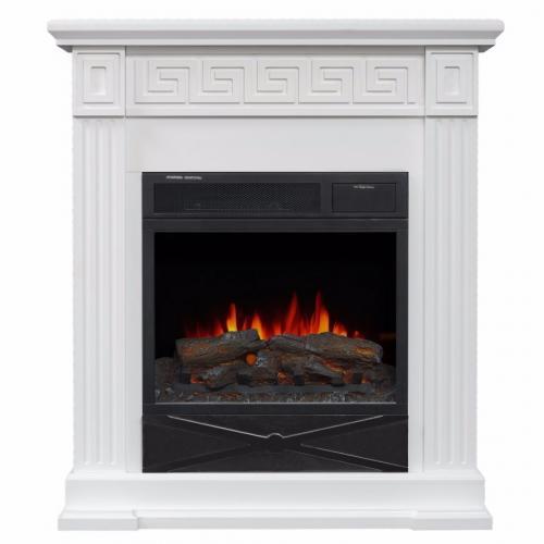 Белоснежный каминный портал украшен декоративным орнаментом выполненном в греческом стиле. Прямые строгие линии в сочетании с шикарный цветом, делают этот небольшой электрокамин и простым, и торжественным.